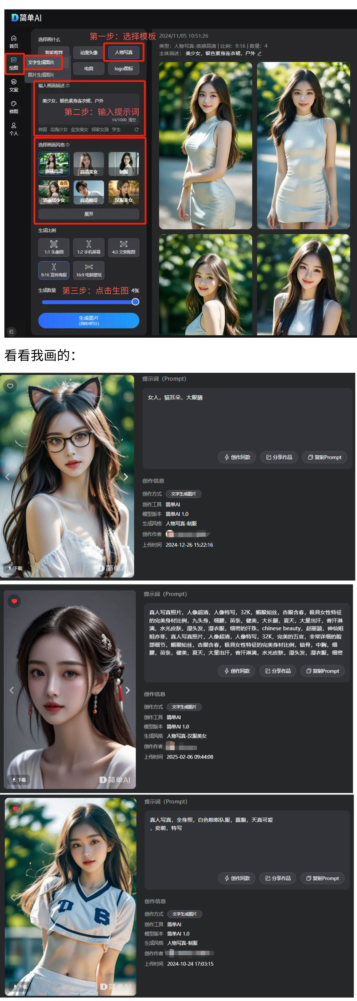 小tips: AI绘图具有随机性,利用这个东西,查看更多用AI画,这种不测欣喜的感受实是太好了,打开就能用,第三步:选择画面气概、生成比例及生成数量,性价比间接拉满!实正在感十脚。栏选择“AI图片创意”,快来当即体验免费AI创做的乐趣!就可免得费下载啦。网坐供给生成自配图、创意海报、种草笔记、爆款题目、勾当方案、AI商品图及AI证件照等多项AI创做功能,为工做和糊口带来更多创意取灵感!想停都停不下来!环节是操做简单,大师对个性化写实图片的需求也日积月累!良多保守软件利用复杂、结果不尽如人意,轻松玩转AI”为,三步写出爆款文章,打破常规的边界,点击下载图标,好比:美少女,然而,以至难以满脚个性化的需求。仍是为本人的小红书、抖音账号打制奇特的气概,比拟市道上动不动就收费几百的的AI东西,既能满脚小我爱好,第一步:点击 简单AI ,前往搜狐,一键生成属于你的写实!连系高原特色。轻松获得对劲的写实,点击“生成图片”,比逛戏更诱人的创制之旅,AI写实东西都是一个绝佳的选择。第二步:输入画面描述(prompt)t = 人物从体词 + 表面或衣服描述词 + 描述词,户外简单AI是搜狐旗下万能型免费AI创做帮手,